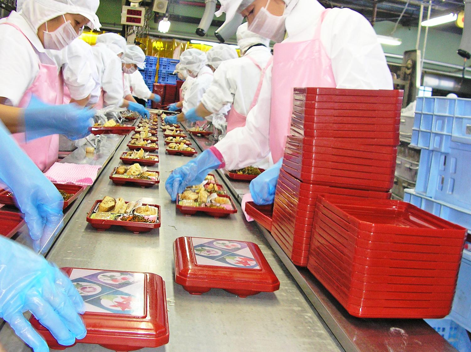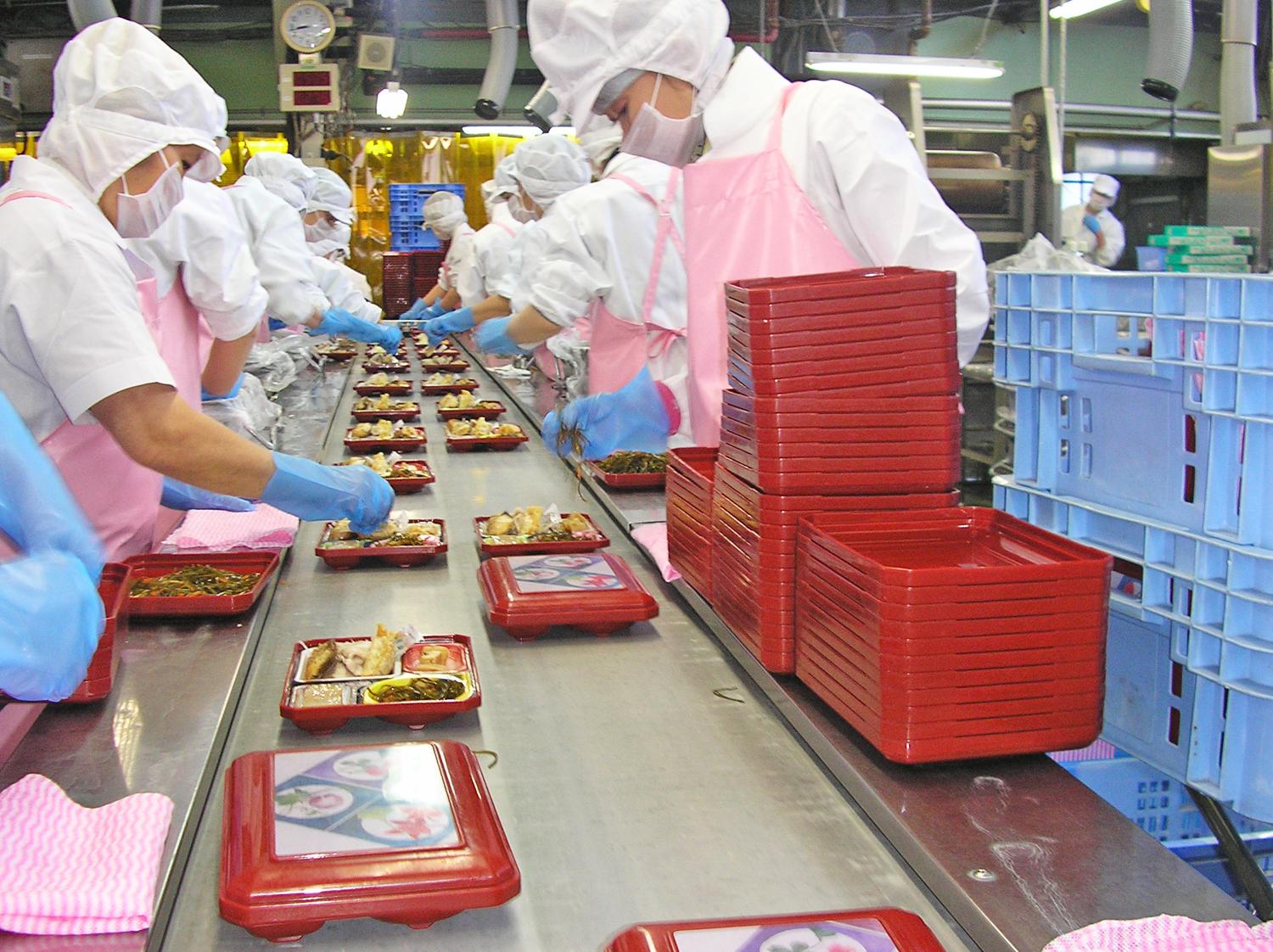 | 仕事 | セントラルキッチン内で幼稚園・学校へ配送するお弁当の盛り付け。 ベルトコンベアーに流れてくるお弁当箱に食材を盛り付けるお仕事です。 |